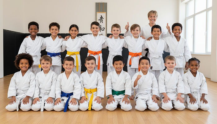 Smiling martial arts kids standing in a row.